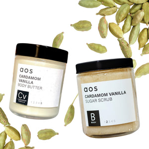 This boxed set includes our generously sized 8oz jars of Cardamom Vanilla Sugar Scrub and Cardamom Vanilla Body Butter, beautifully boxed in our signature aos Skincare style.
